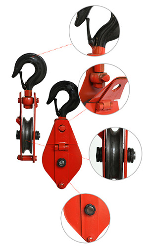 03、優質定向滑輪:滑輪由優質合金,經高 溫淬火精制而成,強度高, 經久性好,表面光潔順滑。
