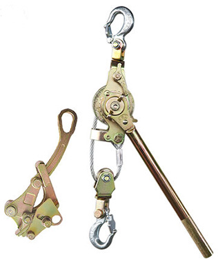 緊線器是在輸電線路鋪設施工現場做為繃緊導線用的。應用時先把緊線器上的鋼絲繩或鍍鋅鐵線松開,并固定不動在橫擔上,用夾線鉗夾住導線,隨后擰動專用型板手。因為棘爪的防大逆轉功效,慢慢把鋼絲繩或鍍鋅鐵線繞在棘輪扳手滾桶上,使導線縮緊。把縮緊的導線固定不動在絕緣子上。隨后先松開棘爪,使鋼絲繩或鍍鋅鐵線松開,再松開夾線鉗,最終把鋼絲繩或鍍鋅鐵線繞在棘輪扳手的滾桶上。
