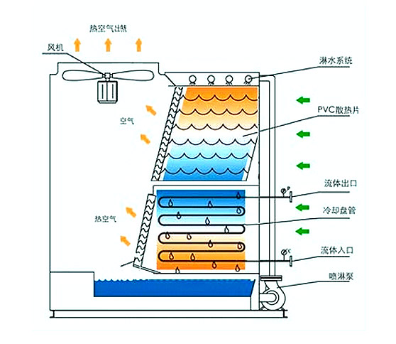 工作流體(純水或防凍液)在閉式冷卻塔的盤(pán)管中循環(huán),工作流體熱量經(jīng)過(guò)盤(pán)管散入流過(guò)盤(pán)管的水中同時(shí)機(jī)組外的空氣從機(jī)組側(cè)面上的進(jìn)風(fēng)格柵進(jìn)入,與水的流動(dòng)方向垂直,向上流經(jīng)盤(pán)管一小部分水蒸發(fā)而吸走熱量,熱濕空氣由冷卻塔頂部的通風(fēng)機(jī)排出到大氣中。其余的水落入底部水盤(pán),由水泵再循環(huán)至水分布系統(tǒng)又回淋到盤(pán)管上。